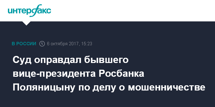 Москва. 6 октября. INTERFAX.RU - Басманный суд Москвы в пятницу вынес оправдательный приговор бывшему вице-президенту Росбанка Тамаре Поляницыной, обвиняемой в особо крупном мошенничестве.