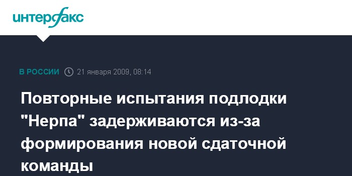 Хабаровск. 21 января. INTERFAX.RU - Испытания атомной подводной лодки "Нерпа", прерванные 8 ноября 2008 года из-за несанкционированного срабатывания системы пожаротушения и гибели 20 человек, откладываются на неопределенный срок из-за формирования новой команды.