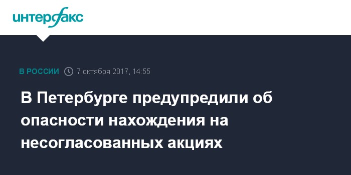 Москва. 7 октября. INTERFAX.RU - Полиция Санкт-Петербурга предупреждает жителей и гостей города об опасности нахождения на несогласованных митингах и ответственности за участие в них.