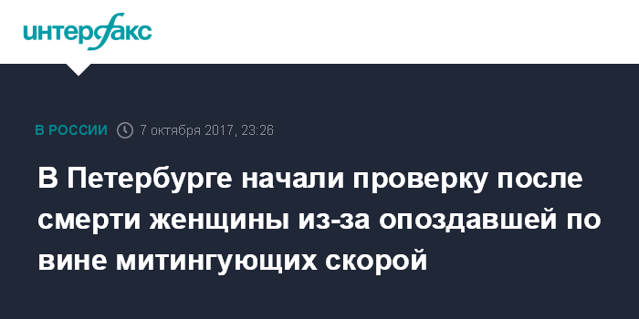Москва. 7 октября. INTERFAX.RU - Полиция в Петербурге начала проверку после смерти женщины, наступившей до прибытия скорой помощи, которую задержали участники несанкционированной акции протеста, вышедшие на проезжую часть в центре города, сообщают в субботу в Главном управлении МВД региона.