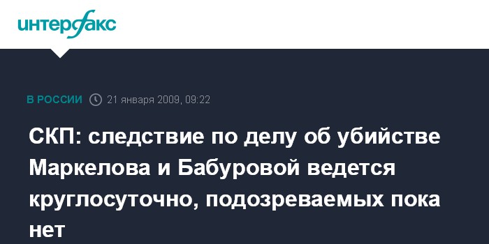 Москва. 21 января. INTERFAX.RU - Работа по розыску убийцы адвоката Станислава Маркелова и журналистки Анастасии Бабуровой ведется в круглосуточном режиме, но задержанных и подозреваемых пока нет, сообщили "Интерфаксу" в Следственном комитете при прокуратуре РФ.