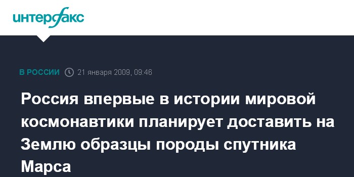 Москва. 21 января. INTERFAX.RU - Глава Роскосмоса Анатолий Перминов сообщил, что Россия в 2009 году отправит к Марсу космический аппарат для того, чтобы доставить на Землю породы со спутника Марса.