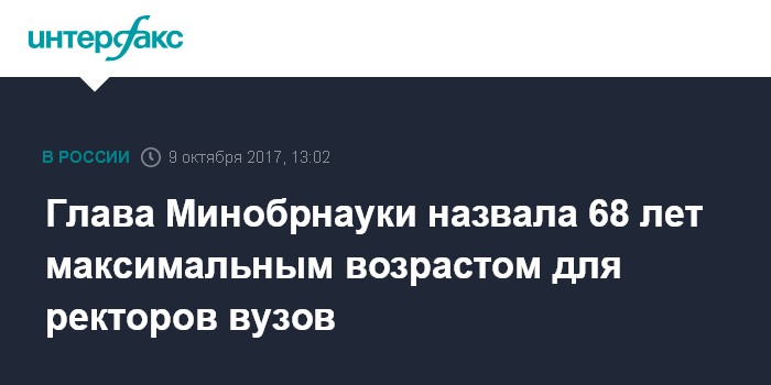 Москва. 9 октября. INTERFAX.RU - Глава Минобрнауки РФ Ольга Васильева выступила против повышения предельного возраста нахождения на посту ректора вуза.