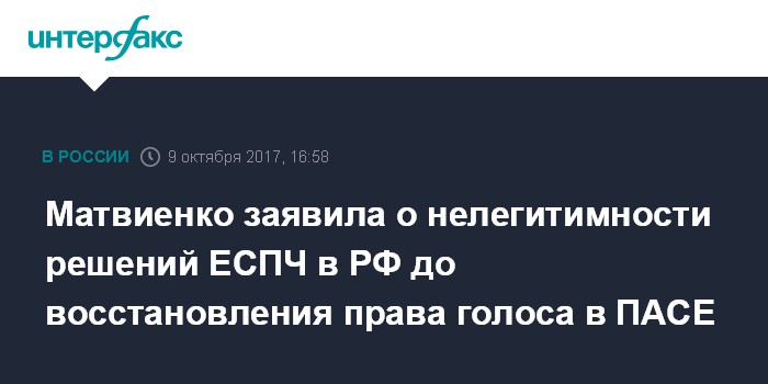Москва. 9 октября. INTERFAX.RU - Решения Европейского суда по правам человека (ЕСПЧ) для России будут нелегитимны, если Парламентская ассамблея Совета Европы (ПАСЕ) не вернет полномочия делегации РФ в следующем году, заявила спикер Совета Федерации Валентина Матвиенко.