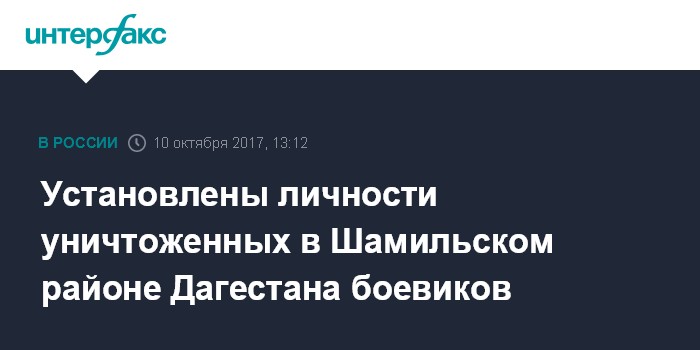 Москва. 10 октября. INTERFAX.RU - Установлены личности уничтоженных в Шамильском районе Дагестана боевиков. Об этом сообщил во вторник агентству "Интерфакс" информированный источник.