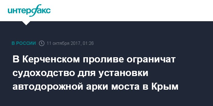 Москва. 11 октября. INTERFAX.RU - Морская операция по транспортировке и установке на опоры второй - автодорожной - арки строящегося моста в Крым начинается в среду, судоходство в Керчь-Еникальском канале ограничат на трое суток.