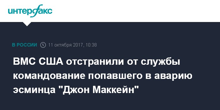 Согласно заявлению, командир Седьмого флота, вице-адмирал Фил Сойер отстранил капитана эсминца "Джон Маккейн" Альфредо Санчеса и старшего офицера Джесси Санчеса от службы в связи с "утратой доверия".