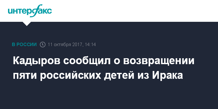 Москва. 11 октября. INTERFAX.RU - Глава Чеченской республики (ЧР) Рамзан Кадыров сообщил о возвращении на родину пяти российских детей, чьи родители ранее уехали семьями в Ирак, где либо погибли в боевых действиях либо попали в заключение.