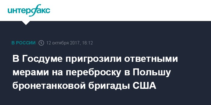 Москва. 12 октября. INTERFAX.RU - Россия предпримет ответные меры в связи с переброской США в Польшу бронетанковой бригады, заявил глава комитета Госдумы по обороне Владимир Шаманов.