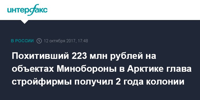 Москва. 12 октября. INTERFAX.RU - Второй фигурант дела о хищении 223 млн рублей, выделенных на строительство военных объектов в Арктике, приговорен в Петербурге к двум годам колонии, сообщает объединенная пресс-служба судов города в четверг.
