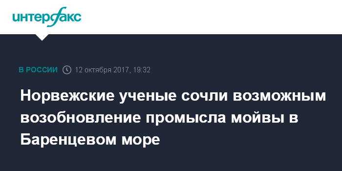 Москва. 12 октября. INTERFAX.RU - Норвежский институт морских исследований считает возможным возобновление промысла мойвы в Баренцевом море после введения моратория в 2016 году.