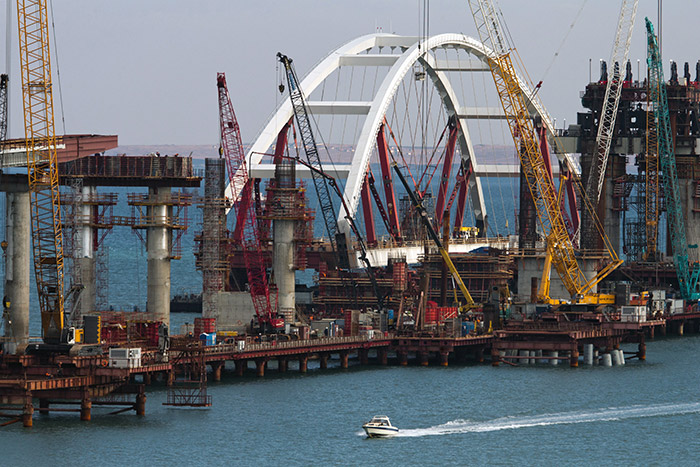 Москва. 12 октября. INTERFAX.RU - Автодорожная арка строящегося в Керченском проливе моста в Крым весом более 5 тысяч тонн поднята в четверг на фарватерные опоры - на высоту 35 метров от уровня моря, сообщил информационный центр проекта.