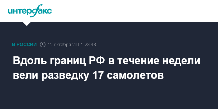 Москва. 12 октября. INTERFAX.RU - 17 самолетов вели воздушную разведку вдоль границ России в течение минувшей недели, сообщило Минобороны РФ.