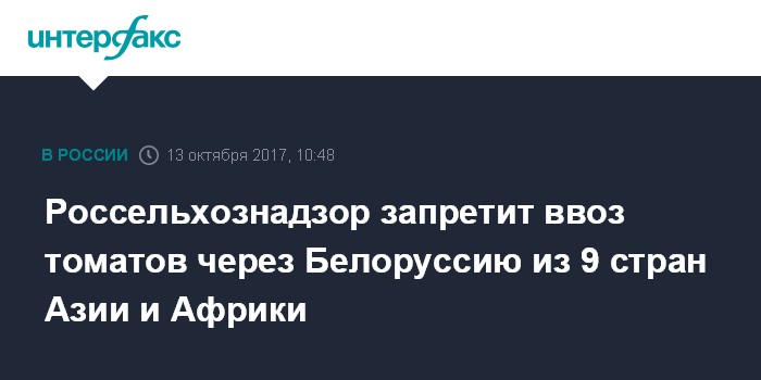 Москва. 13 октября. INTERFAX.RU - Россельхознадзор с 16 октября запрещает ввоз томатов через Белоруссию из девяти стран Азии и Африки.