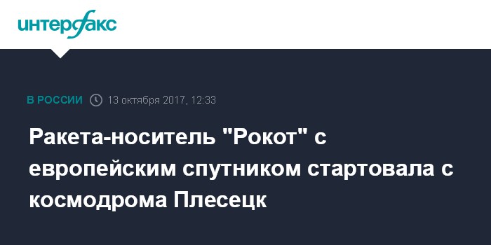 Москва. 13 октября. INTERFAX.RU - Российская ракета-носитель "Рокот" с европейским спутником дистанционного зондирования Земли (ДЗЗ) Sentinel 5p стартовала в пятницу с космодрома Плесецк. Прямая трансляция с места пуска велась в постоянном представительстве Европейского космического агентства (ЕКА) в Москве.