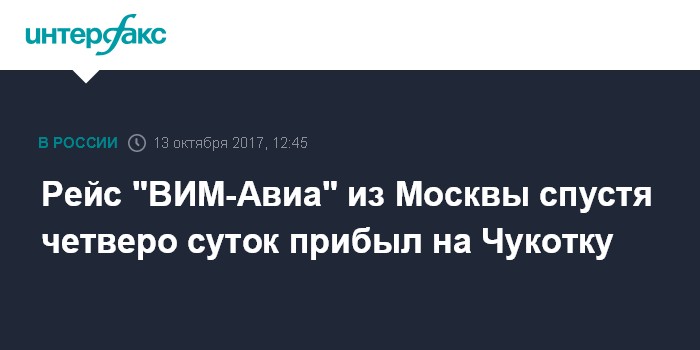 Москва. 13 октября. INTERFAX.RU - Летевшие рейсом авиакомпании "ВИМ-Авиа" от 9 октября пассажиры с опозданием на четверо суток прибыли в пятницу из Москвы в Анадырь.