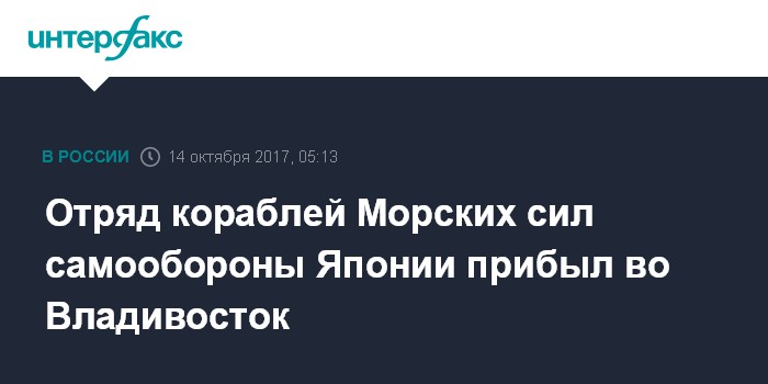 Москва. 14 октября. INTERFAX.RU - Отряд кораблей Морских сил самообороны (МССО) Японии в субботу прибыл с неофициальным визитом во Владивосток - главную базу Тихоокеанского флота (ТОФ).