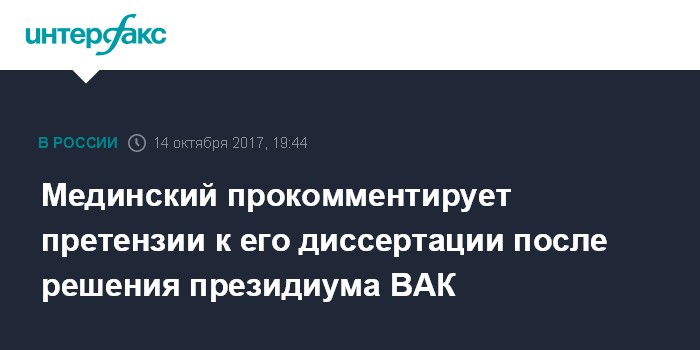 В начале октября Экспертный совет ВАК рекомендовал лишить министра культуры Владимира Мединского ученой степени доктора исторических наук после проверки его диссертации. Окончательное решение по поводу ученой степени Мединского примет президиум ВАК на заседании 20 октября.