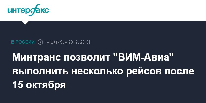 Минтранс позволит "ВИМ-Авиа" выполнить несколько рейсов после 15 октября