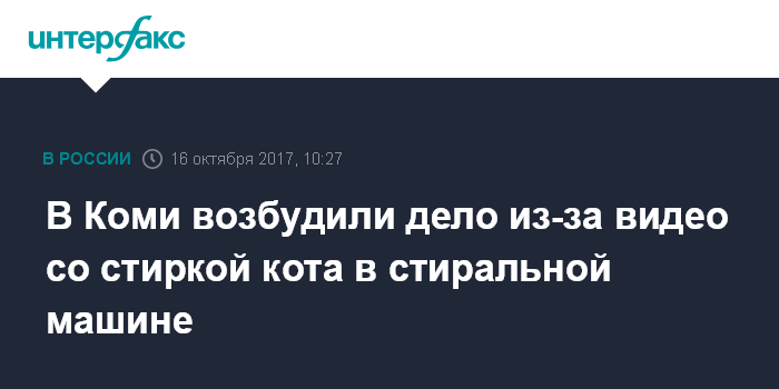 Москва. 16 октября. INTERFAX.RU - В Коми возбуждено уголовное дело в отношении жителя города Ухта, который постирал в машинке кота, снял это на видео и выложил в сеть. Об этом сообщает пресс-служба МВД республики.