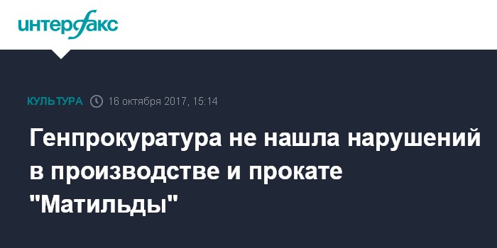 Москва. 16 октября. INTERFAX.RU - В Генеральной прокуратуре России заявили, что не обнаружили нарушений закона при производстве и прокате кинофильма "Матильда", а также об отсутствии признаков возбуждения ненависти в трейлере нашумевшей кинокартины.