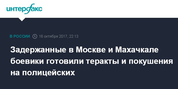 Москва. 16 октября. INTERFAX.RU - Четверо боевиков, задержанных в конце минувшей недели в Москве и Махачкале, планировали теракты и покушения на полицейских, сообщил агентству "Интерфакс" информированный источник.