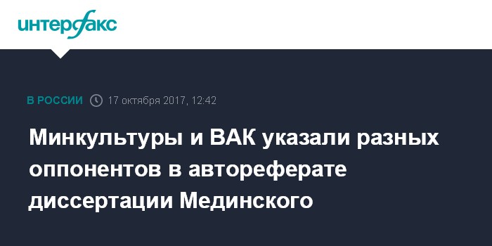 Минкультуры и ВАК указали разных оппонентов в автореферате диссертации Мединского