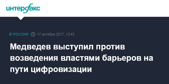 Москва. 17 октября. INTERFAX.RU - Государство не должно возводить барьеры на пути цифровизации, регулирование должно стать более гибким, заявил премьер-министр Дмитрий Медведев, выступая на пленарном заседании конференции "Открытые инновации".