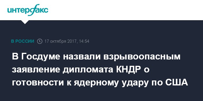 Москва. 17 октября. INTERFAX.RU - Глава комитета Госдумы по международным делам Леонид Слуцкий считает чрезвычайно опасными публичные угрозы о возможности применения Пхеньяном ядерного оружия против США.