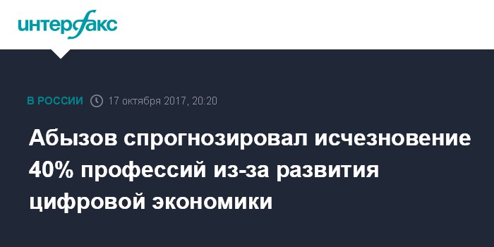 Москва. 17 октября. INTERFAX.RU - Министр по вопросам Открытого правительства Михаил Абызов заявил, что около 30-40% профессий в будущем исчезнет из-за развития цифровой экономики.
