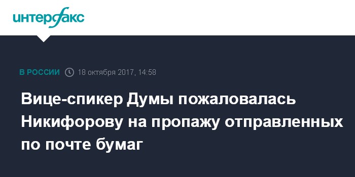 Москва. 18 октября. INTERFAX.RU - Вице-спикер Госдумы Ольга Епифанова пожаловалась на пропажу пакета, который она отправила "Почтой России" из отделения в Госдуме в республику Коми.
