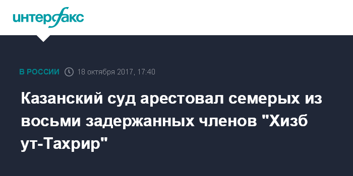 Москва. 18 октября. INTERFAX.RU - Вахитовский районный суд Казани в среду удовлетворил ходатайство следствия об аресте семерых жителей Татарстана, которым предъявлено обвинение в участии в деятельности запрещенной в РФ международной террористической организации "Хизб ут-Тахрир".