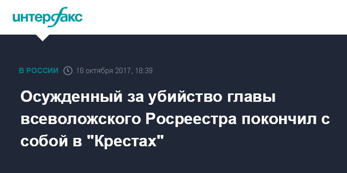 Москва. 18 октября. INTERFAX.RU - Один из четверых осужденных по делу об убийстве начальника Всеволожского отдела управления Росреестра Натальи Захаровой, приговоренный к 17 годам заключения, покончил с собой в камере изолятора менее чем через неделю после вынесения приговора. Об этом сообщил "Интерфаксу" источник в правоохранительных органах города в среду.