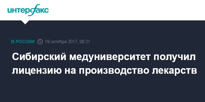 Москва. 19 октября. INTERFAX.RU - Сибирский государственный медицинский университет (СибГМУ) получил лицензию Минпромторга РФ на производство лекарственных средств, сообщила пресс-служба вуза.