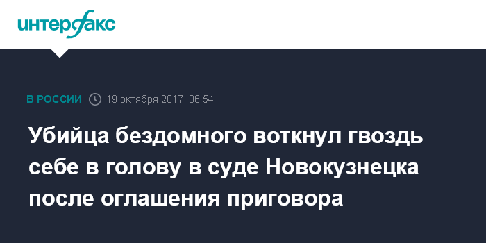 "Его приговорили к 14 годам колонии строгого режима, хотя он рассчитывал на оправдательный приговор. Когда все из зала суда вышли, он начал биться головой об лавочку, после чего достал гвоздь и воткнул в область виска", - сказал собеседник агентства.