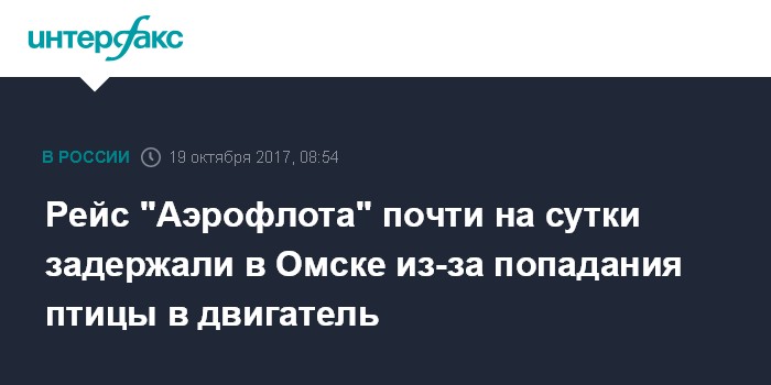 Инцидент произошел во вторник с рейсом Москва-Омск авиакомпании "Аэрофлот". "Во время посадки самолета по глиссаде в его двигатель попала птица. Посадка прошла благополучно, однако вылет самолета обратно в Москву был задержан почти на сутки для его обследования техниками", - сообщил Козловский.