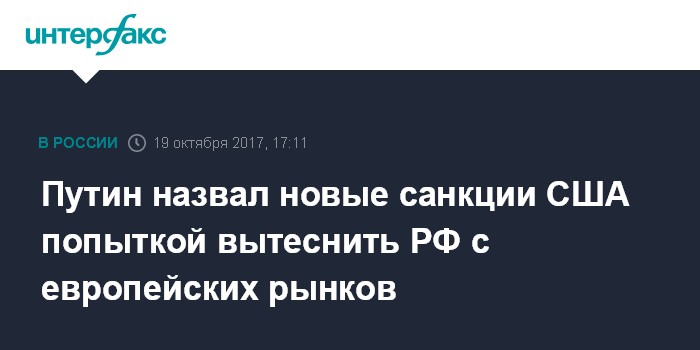 Москва. 19 октября. INTERFAX.RU - Новый санкционный закон США - это попытка вытеснить Российскую Федерацию с энергетических рынков Европы, заявил в четверг президент РФ Владимир Путин.