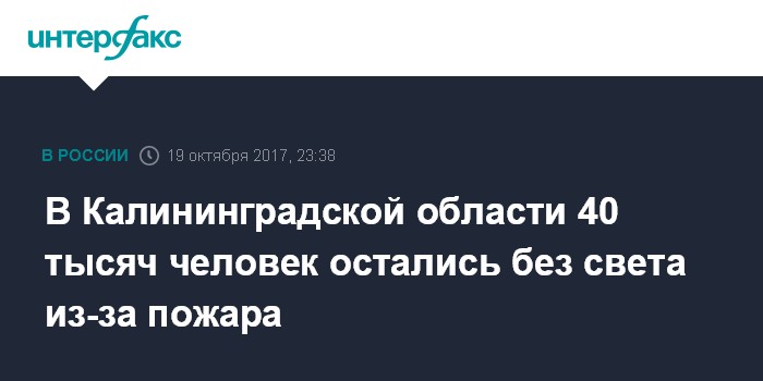 Москва. 19 октября. INTERFAX.RU - В Калининградской области почти 40 тысяч человек остались без света из-за пожара, говорится в сообщении на сайте Минэнерго.