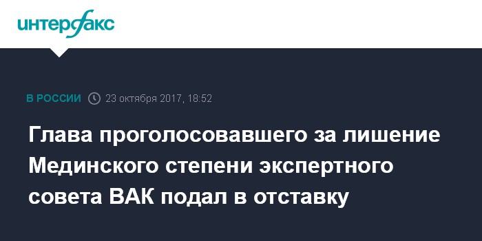 Москва. 23 октября. INTERFAX.RU - Председатель экспертного совета Высшей аттестационной комиссии (ВАК) по истории, рекомендовавшего лишить главу Минкультуры РФ Владимира Мединского степени доктора исторических наук, написал заявление об уходе.