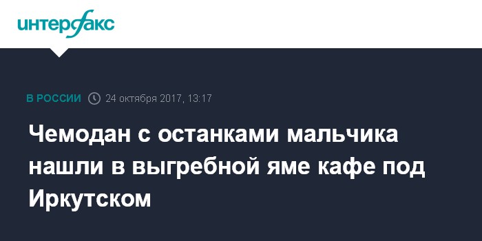 Москва. 24 октября. INTERFAX.RU - Уголовное дело возбуждено по факту обнаружения останков пятилетнего мальчика в выгребной яме одного из кафе в поселке Солнечный-1 Иркутского района Иркутской области, сообщила во вторник пресс-служба следственного управления СКР по региону.
