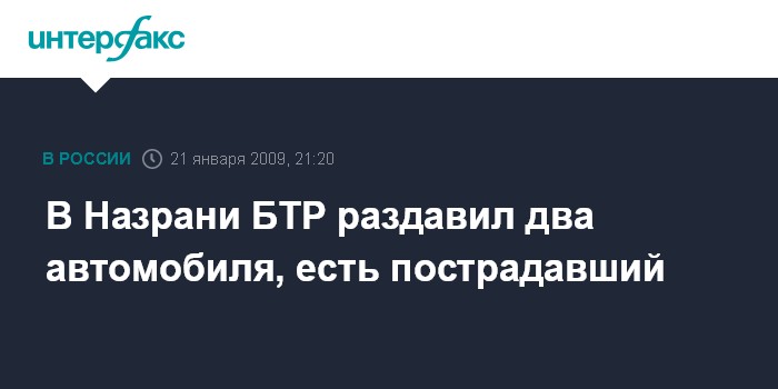 Назрань. 21 января. INTERFAX.RU - БТР с военнослужащими переехал две легковые автомашины на окраине Назрани на федеральной трассе "Кавказ" у поста возле административной границы с Северной Осетией, пострадал один человек.