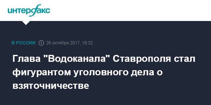 Ставрополь. 26 октября. ИНТЕРФАКС-ЮГ - Уголовное дело возбуждено в отношении директора муниципального унитарного предприятия (МУП) "Водоканал" Ставрополя, подозреваемого в получении взятки в размере 4 млн рублей, сообщает пресс-служба Следственного управления СКР по региону.