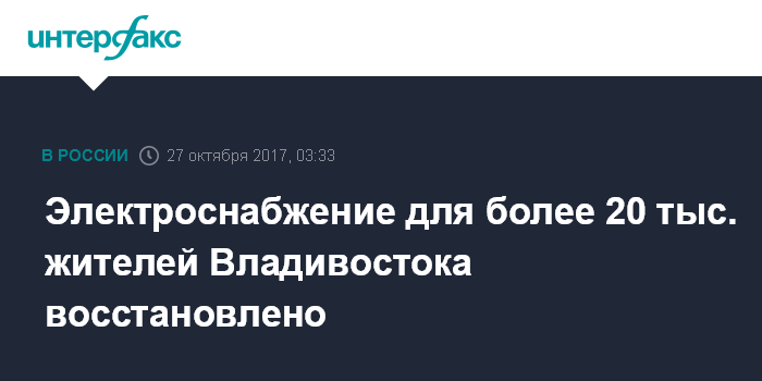Владивосток. 27 октября. ИНТЕРФАКС - ДАЛЬНИЙ ВОСТОК - Энергоавария, которая в четверг вечером оставила без электроснабжения около 20,7 тыс. жителей и часть промышленных предприятий Владивостока, была устранена за несколько часов.