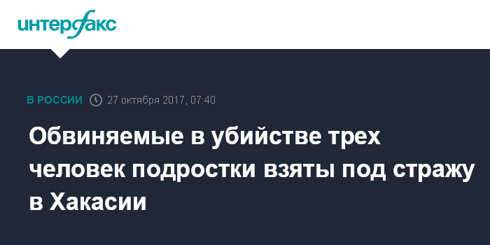 Абакан. 27 октября. ИНТЕРФАКС-СИБИРЬ - Подростки в возрасте 16-17 лет, которых обвиняют в убийстве четы пенсионеров и мужчины в селе Таштып (республика Хакасия) взяты под стражу, сообщает пресс-служба следственного управления СКР по республике Хакасия в пятницу.