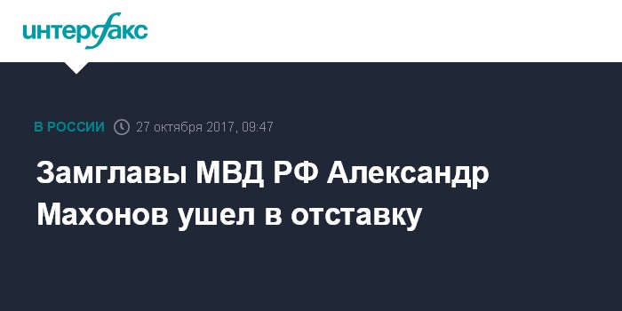 Москва. 27 октября. ИНТЕРФАКС - Замминистра внутренних дел РФ Александр Махонов подал рапорт об отставке, сообщила "Интерфаксу" в пятницу официальный представитель ведомства Ирина Волк.