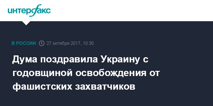 Москва. 27 октября. INTERFAX.RU - Госдума на заседании в пятницу приняла постановление о поздравлении народа Украины с 73-й годовщиной освобождения от немецко-фашистских захватчиков.