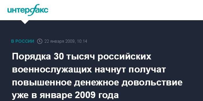 Москва. 22 января. INTERFAX.RU - Повышенное денежное довольствие от 35 тысяч рублей начнут получать порядка 30 тысяч военнослужащих уже с конца января 2009 года, сообщил министр обороны Анатолий Сердюков на встрече с президентом РФ Дмитрием Медведевым.