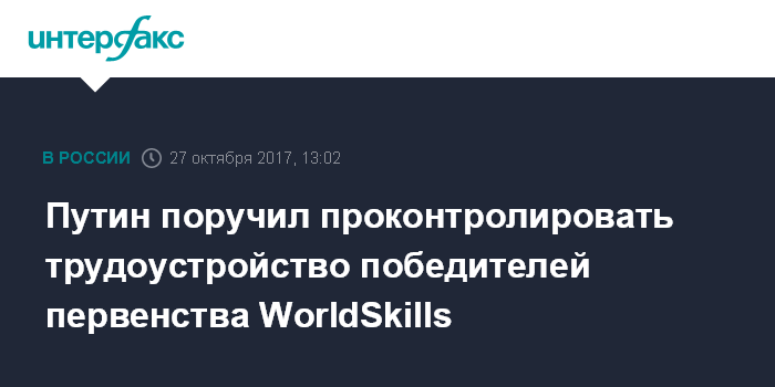 Москва. 27 октября. INTERFAX.RU - Президент РФ Владимир Путин поручил вице-премьеру Ольге Голодец проконтролировать трудоустройство российских победителей первенства WorldSkills в Абу-Даби.