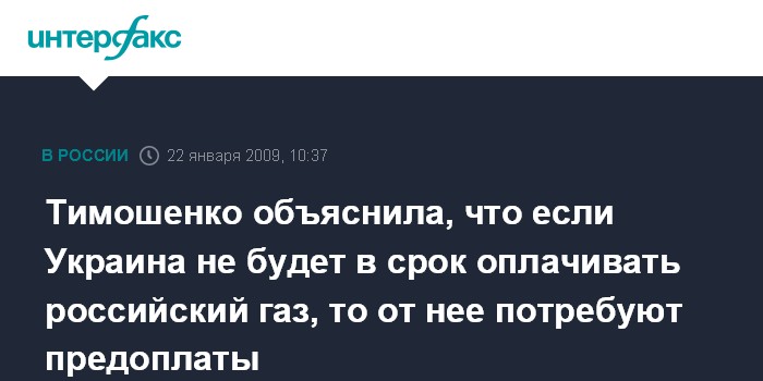 Москва. 22 января. INTERFAX.RU - Если Украина не будет платить за поставки российского газа в 2009 году вовремя, то ей будет выдвинуто требование предоплаты газа, заявила премьер-министр Юлия Тимошенко, комментируя в эфире телеканала "1+1" подписанные в Москве договоренности о поставках газа.