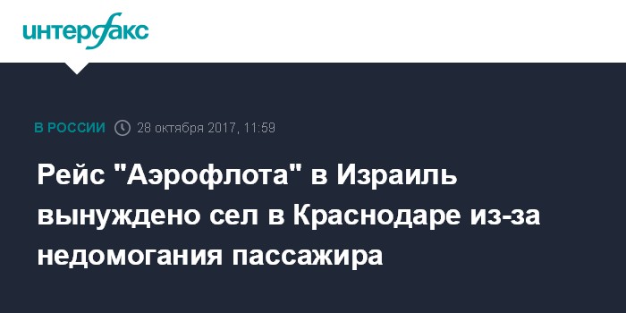 "Накануне в 09:06 по московскому времени в аэропорту Краснодара совершил вынужденную посадку самолет авиакомпании "Аэрофлот", следовавший из Москвы в Израиль. Причиной посадки стало плохое самочувствие одного из пассажиров", - сказал сотрудник пресс-службы.